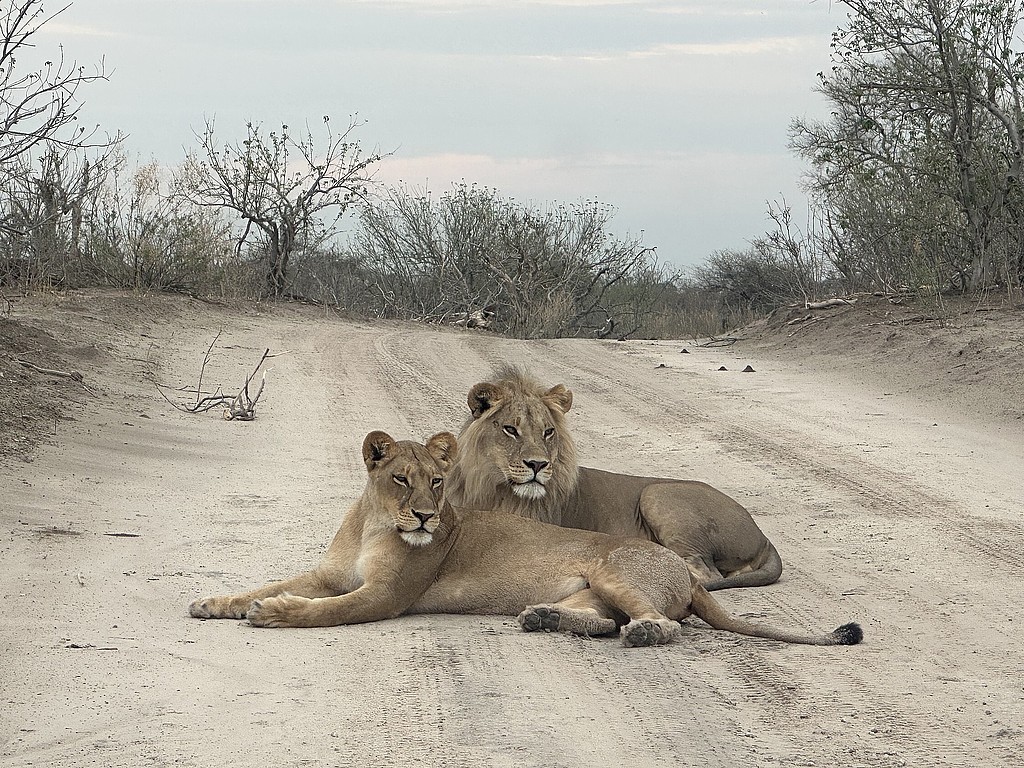 Die ersten Nächte verbrachten wir hier und machten von der Lodge aus einen Tagesausflug ins Moremi Game Reserve. Wir hatten Glück: weil es sehr ruhig war, waren wir die einzigen Gäste auf dem Game Viewer – einem offenen Safari-Fahrzeug/4x4-Geländewagen – mit dem wir früh am Morgens in den Nationalpark aufbrachen. Begleitet wurden wir von einem qualifizierten Guide, der uns sicher über die unbefestigten Wege des Parks navigierte. Wir machten mehrere Pausen an atemberaubenden Orten mitten in der Natur, wo wir bequem auf gemütlichen Campingstühlen sitzend unser von der Lodge gestelltes Frühstück, sowie Mittagessen, Snacks, Kaffee und Tee genießen durften. Gegen späten Nachmittag waren wir wieder zurück an der Lodge und konnten es nicht fassen, wie viele Wildtiere wir zu sehen bekommen hatten. Unser schönster Moment ereignete sich kurz vor Verlassen des Reserves, als sich ein Löwenpaar direkt vor uns auf die Straße legte. Wunderschöne Tiere.