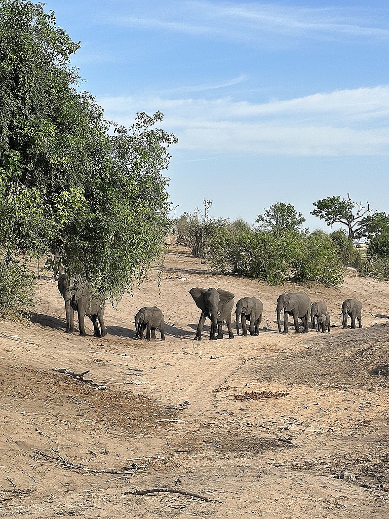 Früh am nächsten Morgen starteten wir die Safari wieder im offenen 4x4-Geländewagen und folgten, mit unserem Guide am Steuer, den sandigen Pisten entlang des Ufers und durch dichtes Waldland. Diesmal war unser Wagen mit acht Leuten voll besetzt. Wir suchten die Büsche nach Löwen und Leoparden ab, während wir immer wieder an Aussichtspunkten hielten, um den weiten Blick über die Floodplains und auf Elefantenherden zu genießen. Am Nachmittag erreichten wir glücklich wieder Kasane und hatten viele neue Eindrücke gewonnen.
