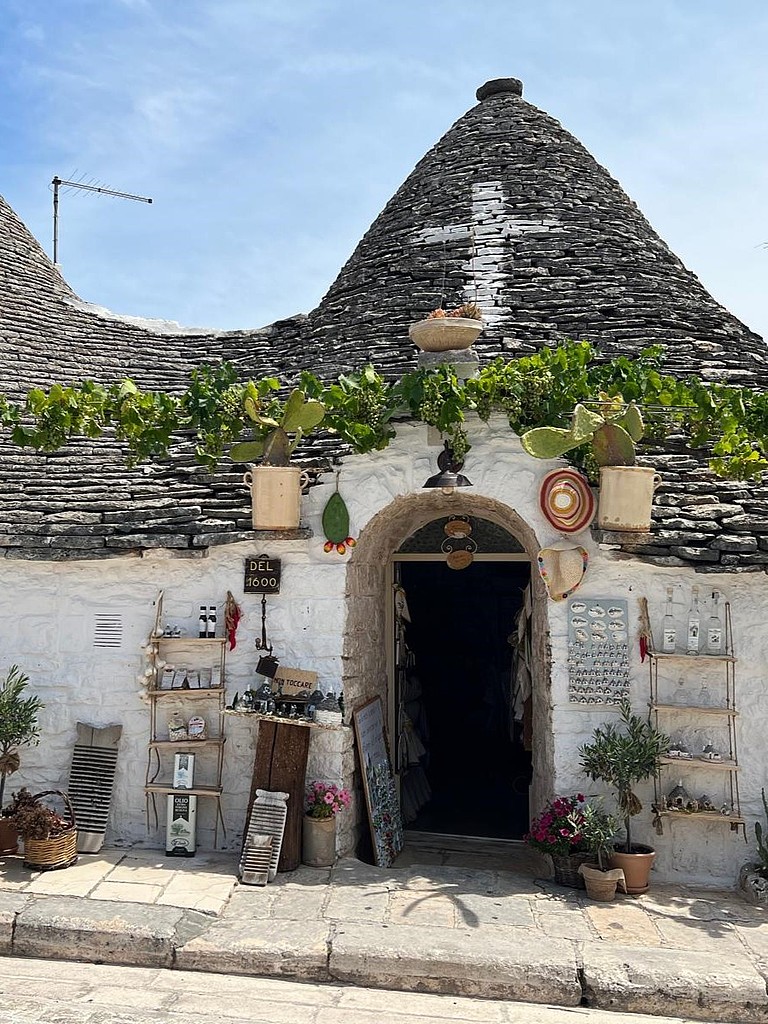 In Alberobello änderte sich das Bild komplett. Überall Trulli. Kleine, weiße Rundhäuser mit ihren markanten Dächern. Früher dienten sie als einfache Unterkünfte, heute findet man zahlreiche Läden, Restaurants und Ferienhäuser darin.