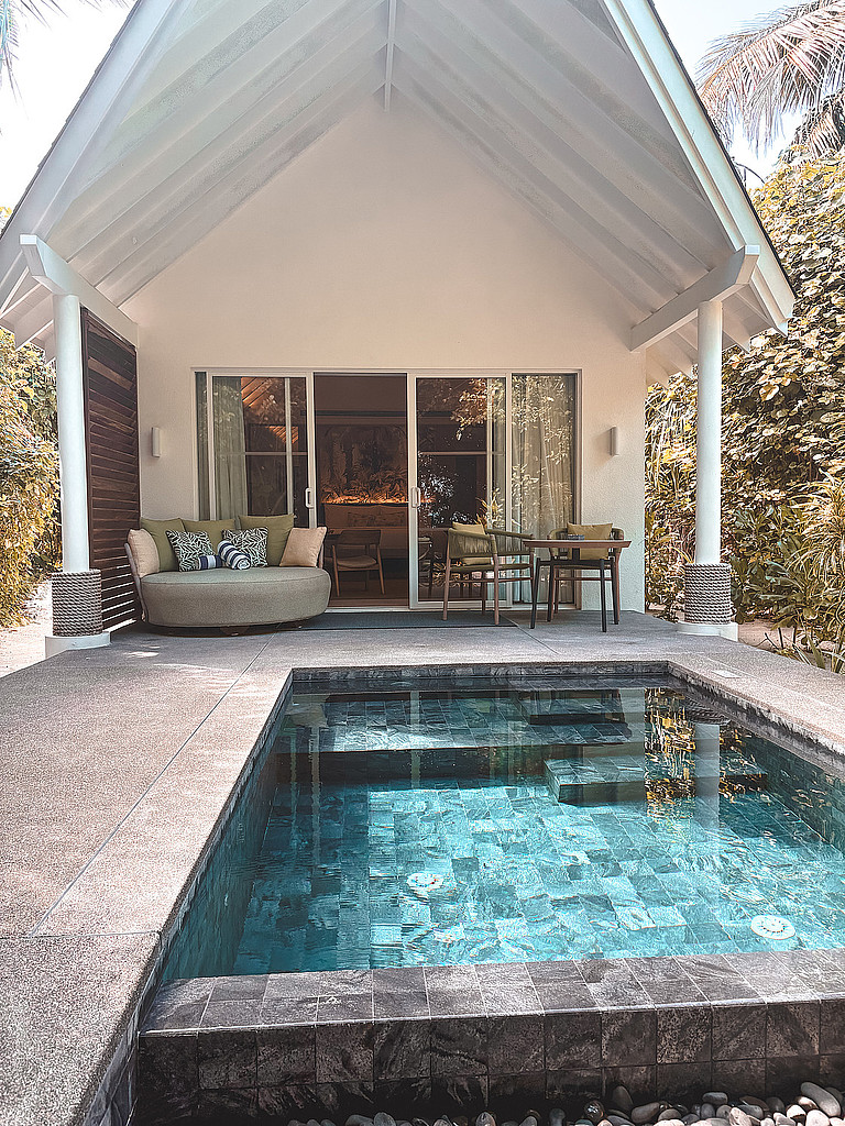 Der Transfer zur Beach Villa führte über kleine Wege durch üppige Vegetation. Und dann standen wir plötzlich vor unserem „Zimmer“: einer eigenen Beach Pool Villa mit wunderschönem und modernem Interieur, eingebettet in die Natur, mit einem privaten Pool und nur wenigen Schritten bis zum Meer.