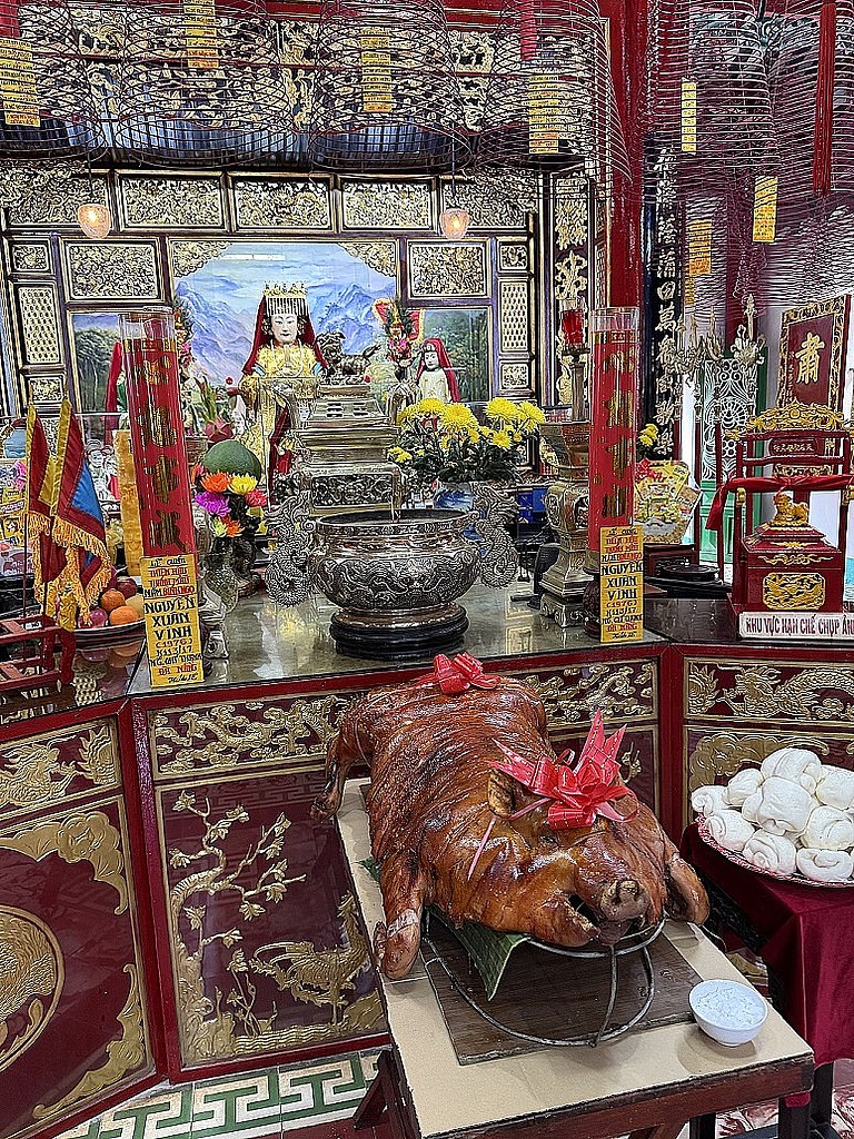 Auch in Hue spürt man die Geschichte des Landes. Tempel, Pagoden und alte Paläste erzählen von der Zeit der Kaiser. Überall begegnet man in Vietnam religiösen Orten. Pagoden und Tempel gehören fest zum Alltag der Menschen. Besonders spannend fand ich die Opfergaben. Neben Obst, Blumen, Cola, Alkohol und Räucherstäbchen lagen auch manchmal Dinge auf den Altären, die ich dort nicht erwartet hätte. In einem Tempel stand tatsächlich ein Spanferkel als Opfergabe angerichtet. Ein Anblick, der mich zunächst überrascht und dann zum Schmunzeln gebracht hat.